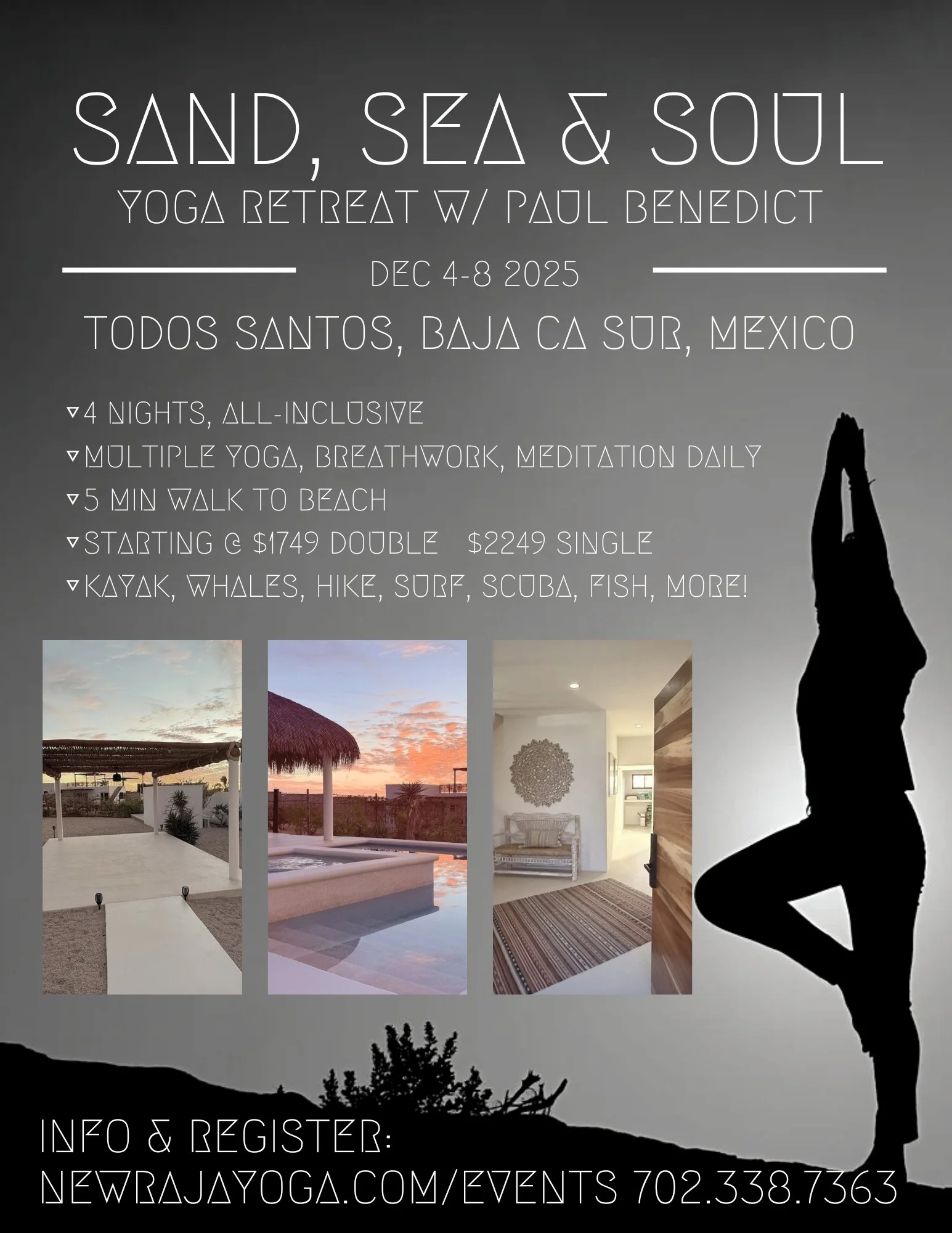 Spend four nights in the village of El Pescadero in beautiful Southern Baja California, 45 minutes north of Cabo San Lucas, close to the popular “Magic Village” of Todos Santos. Enjoy breathtaking sunrise and sunset views from the Casa Rana estate overlooking the ocean while deepening your yoga practice with Paul Benedict and enjoying the elevated cooking of gifted renowned chef Sergio Rivera.